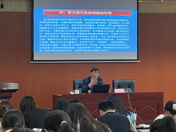 齐教授围绕“深刻认识党的二十大召开的重大意义”、“加深理解党的二十大主题”、“认真学习党的二十大报告的主要内容”、“奋力谱写更加绚丽的华章”四方面展开,以“两个极不”、“三个之变”、“四个之问”为切入点深入剖析党的二十大召开的重大意义,梳理解读党的二十大报告历史脉络,详细阐释报告中重大理论观点的思想逻辑、内在关系、时代意蕴。齐教授指出,党的二十大报告通篇突出中国特色社会主义这面伟大旗帜的引领作用,对奋力谱写新时代中国特色社会主义更加绚丽的华章具有“立纲铸魂”的重大意义。