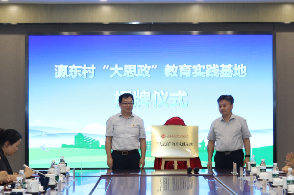 王军华和黄宗逵为我校“大思政”教育实践基地(陈家镇瀛东村)揭牌。陈展阳向“绿动未来 构筑幸福之城”项目团队代表授旗。国际经贸学院寇忻悦同学结合调研经历,以《用数字记录中国发展 以科技赋能城市未来》为主题作微演讲。