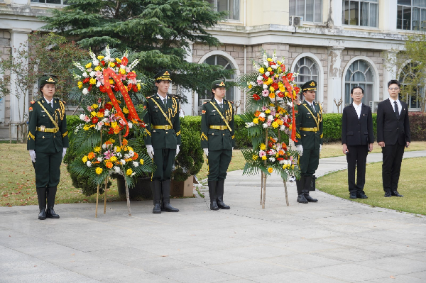 在潘序伦老校长纪念像前,师生代表手持鲜花,脱帽肃立,向老校长行三鞠躬礼,并默哀致敬,表达对“中国现代会计之父”与“一代会计宗师”的无限敬仰与怀念。