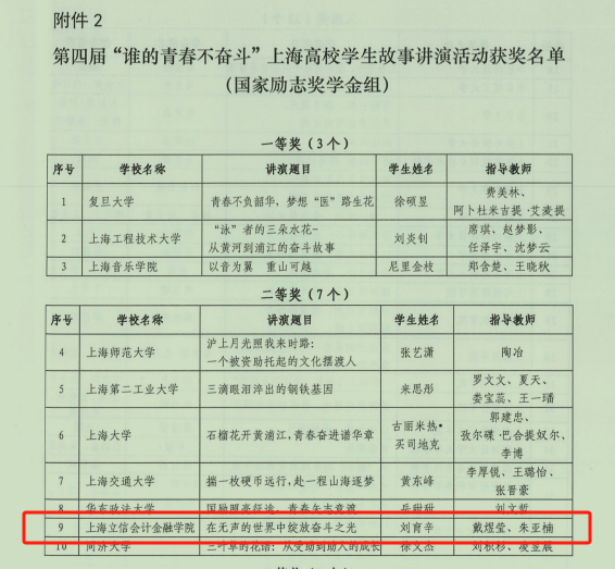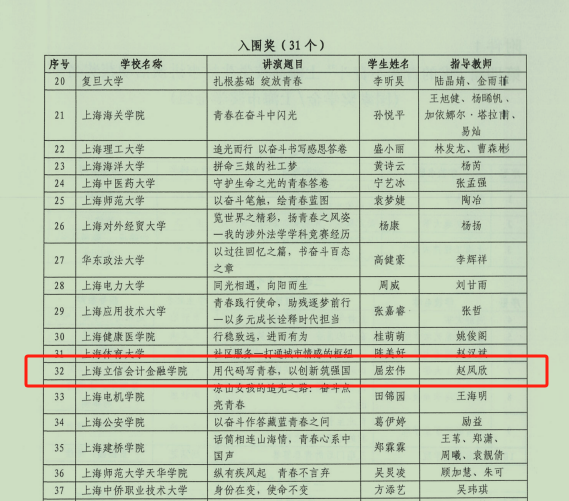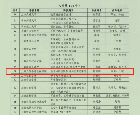 此外,国际经贸学院屈宏伟同学获国家奖学金/上海市奖学金组入围奖,工商管理学院姚国辉同学获退役士兵组入围奖,他们的表现同样展现了立信学子的良好精神风貌。